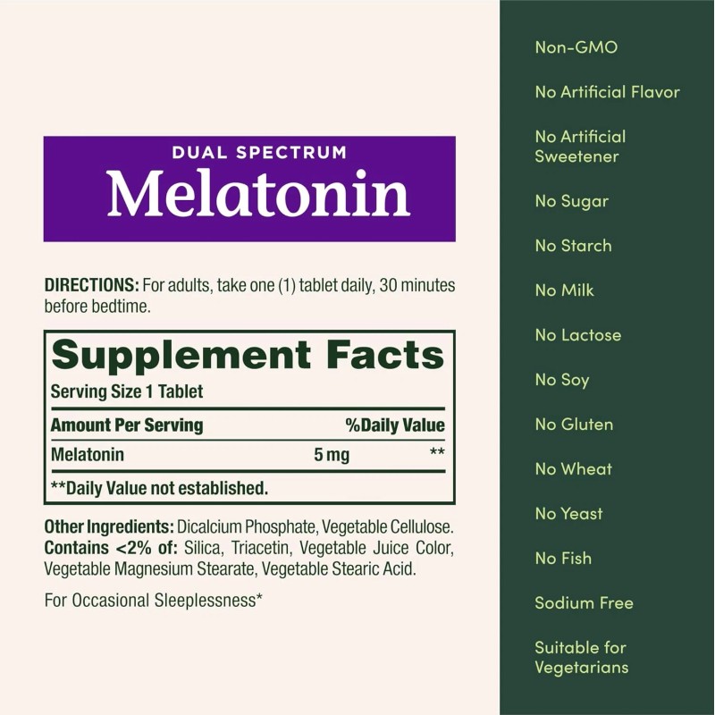 Nature's Bounty Dual Spectrum Melatonin tablets contain two layers: quick release and extended release, helping you fall asleep faster and stay asleep longer. (1) If stress and a busy schedule are making it hard to get a good night's rest, Melatonin may be the sleep supplement you need for occasional sleeplessness. (1) Bi-layer technology ensures the quick release portion of each tablet delivers ingredients fast and effectively, while the extended release portion works over the course of several hours to promote sound sleep. (1) Designed to support specific dietary needs, Nature's Bounty Dual Spectrum Melatonin tablets are gluten free, dairy free, and wheat free, and contain no artificial flavors or sweeteners.