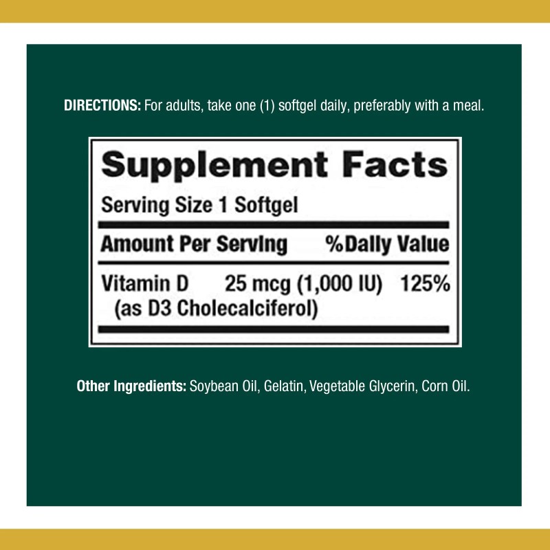 Nature's Bounty Vitamin D - the "Sunshine Vitamin" is an essential nutrient that the body creates by converting cholesterol in the body via sunshine. However, today's culture of cubicles, sunscreen, and near-round-the-clock indoor living minimizes our exposure to natural sunlight for the needed period of time for Vitamin D to form. Supplementing with Nature's Bounty Vitamin D3 is an easy way to increase your daily intake of this important nutrient.