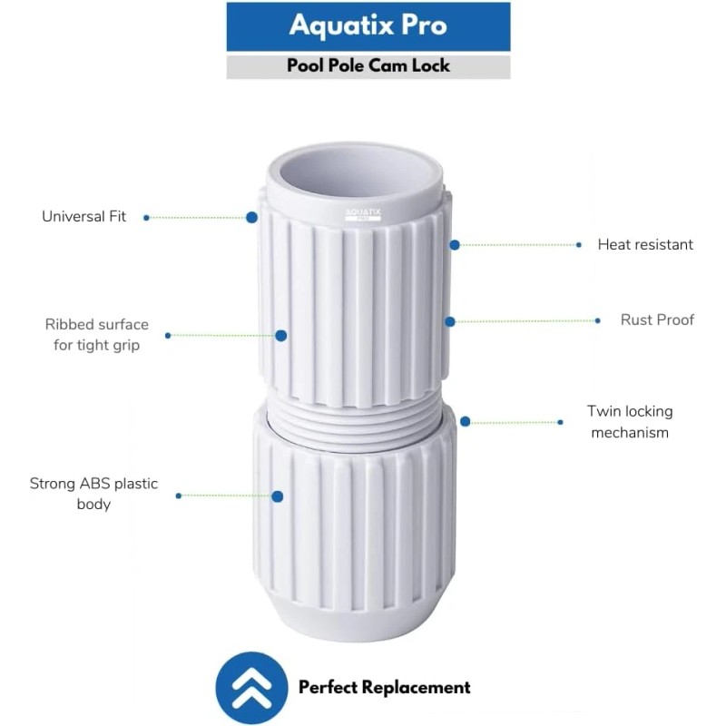 REVIVE YOUR POLE: Don't throw your pool pole away! Simply install the Aquatix Pro pole cam lock and bring your pole back to life, it’s that simple! PERFECT FIT: Perfect replacement cam lock that slips on nice and snug, not requiring any glue or tools. Simply work off old fitting, remove old glue and crud, pop the new one on and you are in business. UNIVERSAL SIZE: Works effortlessly with all standard telescopic swimming pool poles. This cam lock is designed for 2 section extendable poles. BUILT TO LAST: Strong ABS plastic body with threaded non-slip design for better grip. Easy to rotate. Twin cam locking system for better hold. Rust-proof and heat resistant. OUR PROMISE: We go the extra mile to ensure you are fully satisfied with your purchase. With the Aquatix Pro satisfaction promise you get one year warranty on all our products. If you are not satisfied, we will refund you the full price, no questions asked!