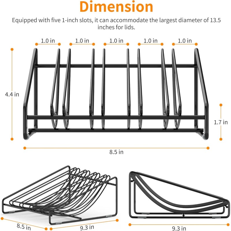- 【Compact Dimensions】Measuring 9.3" x 8.5" x 4.4", this pot lid holder has five 1-inch slots, fitting lids up to 13.5" in diameter. It’s perfect for small kitchens and helps free up countertop and cabinet space.