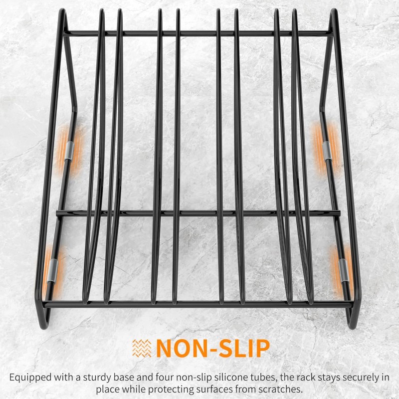 - 【Stable & Non-Slip】Equipped with a sturdy base and four non-slip silicone tubes, the pot lid rack stays securely in place while protecting surfaces from scratches.