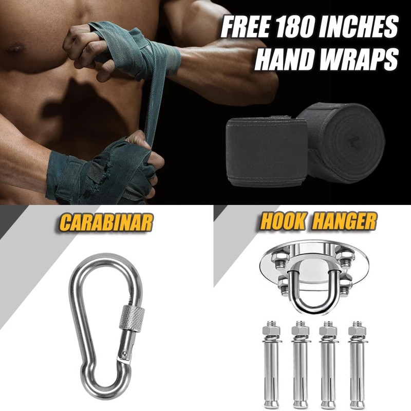- 【360° Swivel and Sturdy Hanger】Unique 360° Swivel keeps the bag rebound freely after being hit. Equipped with reinforced bag hanger, 4 expansion bolts and a carabiner, it can hold up to 1100LB! Screw up the hanger and start your boxing training!
