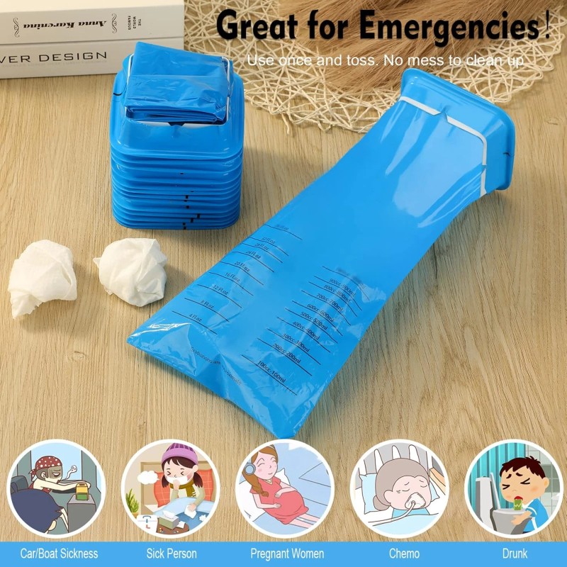 - Easy to Use - The Bags are easy to store and quick to get. Also use them in your home and they work great when you may not make it to the restroom in time. They sit right your side, 1200ML Capacity big enough to hold whatever comes out! No leaking!