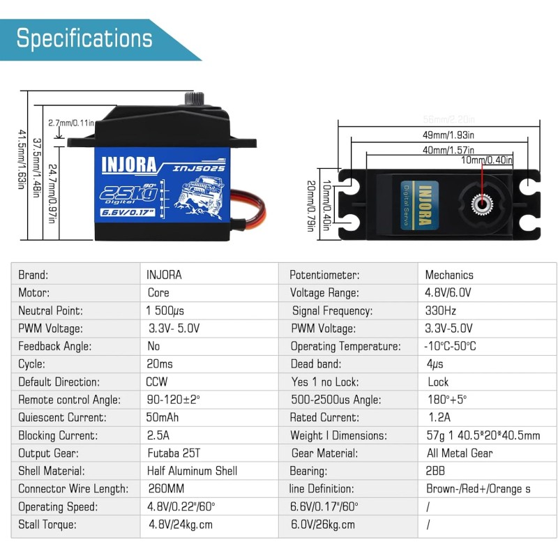 The main features of INJORA RC Servo are large torque, high compatibility, sensitive and responsive.