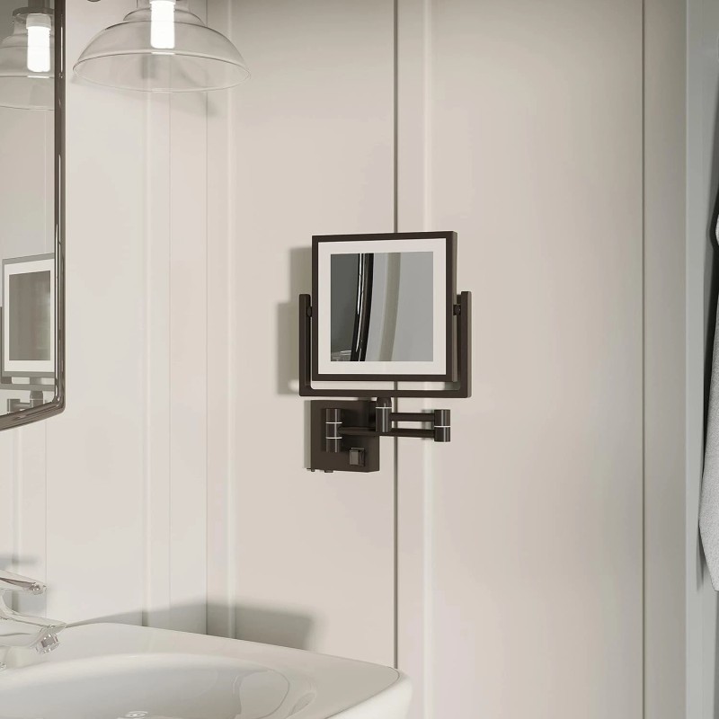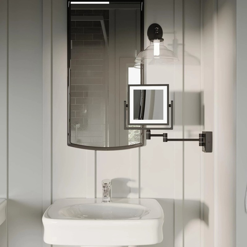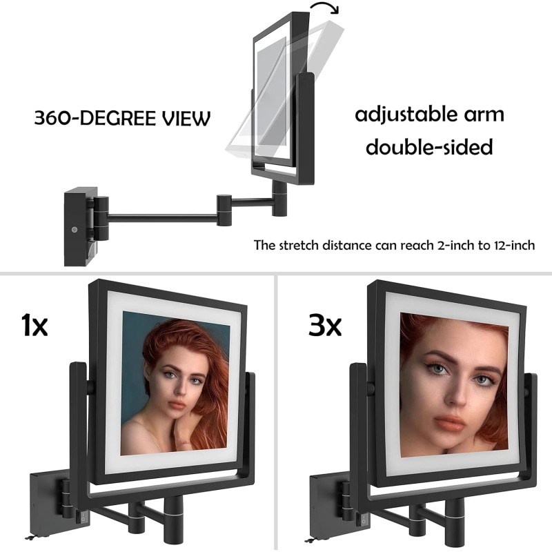 - 360-DEGREE VIEW:The adjustable arm of the vanity mirror can be rotated 360 degrees. This 8-inch illuminated mirror is double-sided. One side is regular mirror and the other is 3X magnification mirror. The illuminated 3x magnifying glass can be used for close-up details, especially suitable for you to apply eye shadow, wear contact lenses, squeeze acne and so on. You can pull it towards your face to have a close-up shot, and then lean against the wall when you are done using it to save space.