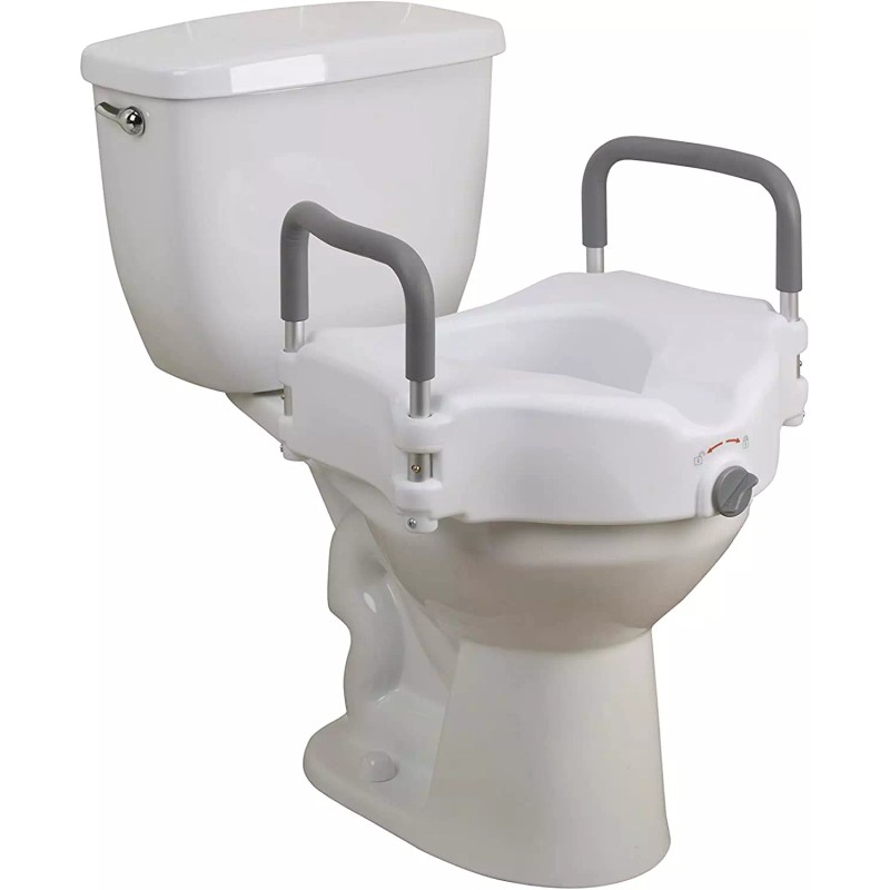 The Drive Medical toilet seat riser with handles is designed to aid people in getting up and sitting down. This locking device comes with a larger, heavy-duty "worm screw" and locking plate for a safe, secure fit. Our elevated toilet seat adds an extra 5 inch of height to the toilet and includes padded armrests that can be easily adjusted or removed. It fits on most elongated and standard toilets and installs without tools. Backed by a limited lifetime warranty from Drive Medical, a leading brand of bathroom safety products, mobility aids, and other medical goods for more than 20 years, you can purchase with confidence.