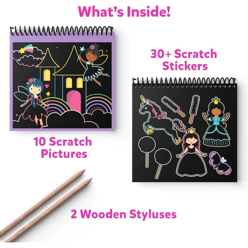 - Included Components: 10 Scratch Pictures, 2 Wooden Styluses, 30+ Scratch Stickers