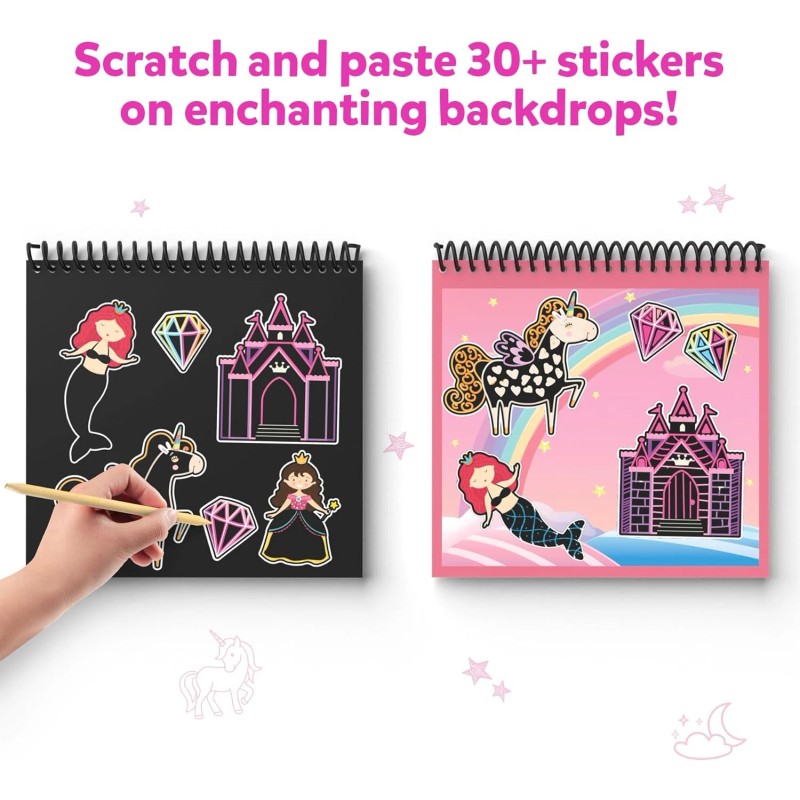 - MAGICAL SCRATCH ART BOOK: Scratch over and make patterns to reveal colorful pictures, and create your own sticker art with princesses, castles, and more as you paste them on enchanting backdrops!