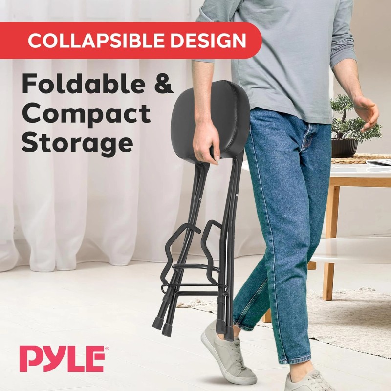 - COLLAPSIBLE DESIGN: The guitarists folding stool features a quick release pin for compact storage. The collapsible design makes it easy to pack up & store. For tighter storage areas simply remove the backrest to break down the seat even further