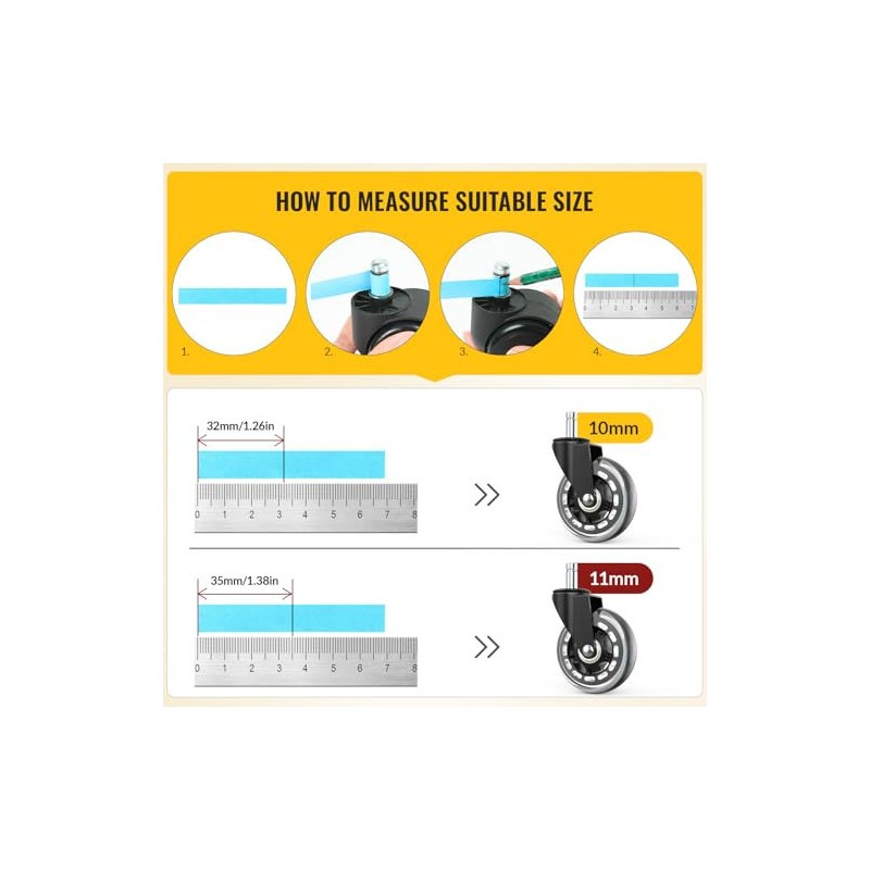 STEM SIZE AND WARRANTY: Stem size with 3/8" (10mm) diameter x 7/8" (22mm) length, fits most IKEA and few desk&chair wheels. 1 year warranty, free replacement. Please do not hesitate to contact us if you need any assistance.