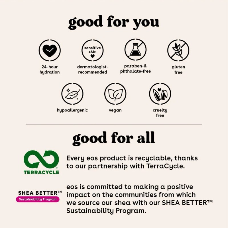 - ALL-NATURAL SHEA BUTTER: eos skin care products have wild grown, sustainably-sourced 100% natural shea butter, leaving skin moisturized. We are paraben, phthalate and gluten-free. Dermatologist tested. Vegan. Hypoallergenic. Leaping Bunny certified.