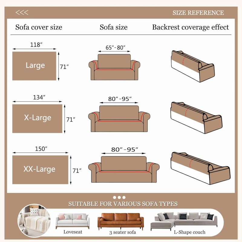 - Size Guide: Recommend Large Size 71" x 118" for Loveseat; X-Large Size 71" x 134" for sofa; XX-Large Size 71"x150" for oversized sofa. Covers for couch provide full protection for various sofa types, such as loveseat, futon, armrest sofa, 3-4 seat sofa or recliner couch. For sectional couch, L-shaped sofa need 2 piece slipcover and 3 piece works well on U-shape couch. Please measure your sofa before purchasing