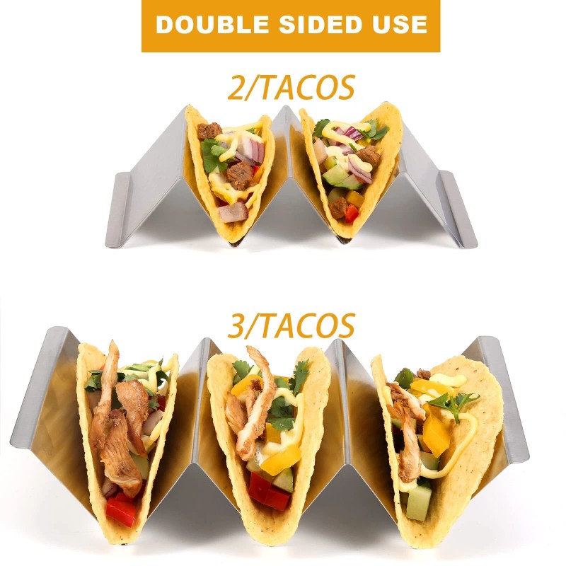 - Double-sided Use: Taco tray holder is designed for use on double-faced. One side is used for 3 tortillas, and the other side is used for 2 tortillas. They are stackable, so they take up little space in your cabinet.