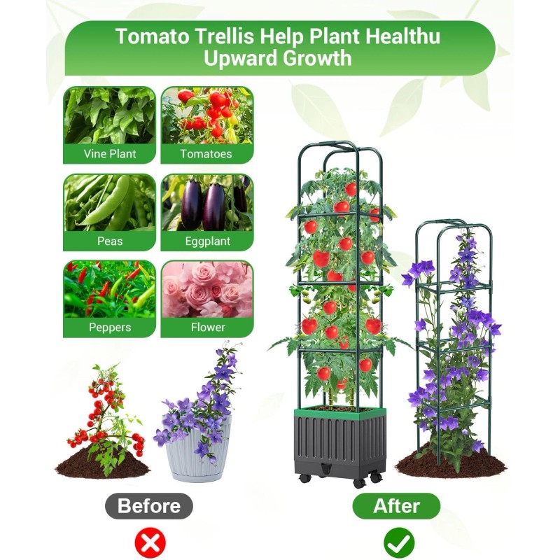 - 【WIDELY USED】Want to grow vegetables or flowers, but don't have space? Consider our tall self watering tomato Planter, used indoors and outdoors, terraces, greenhouses, etc. Very suitable for growing grapes, peas, tomatoes, strawberries, roses, cucumbers, etc.