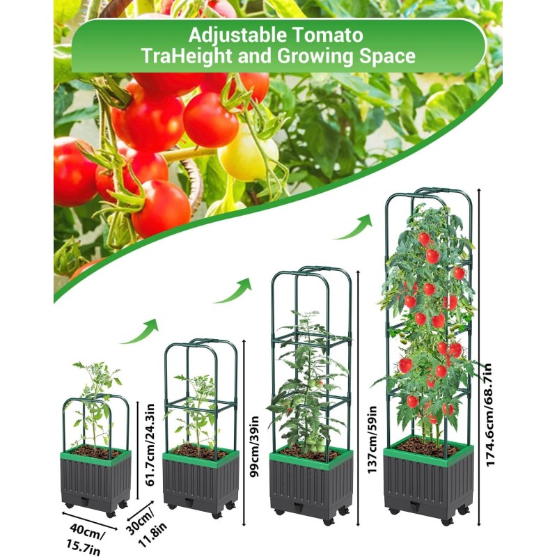 - 【TALL TOMATO PLANTER】In order to meet the needs of plant growth, we designed this higher, larger and deeper planter box with trellies. The planter box is 15.7 inches long, 11.8 inches wide and 11 inches high. The overall height of the planting box is 68.7 inches, which provides sufficient growth space for your climbing vegetables and flowers.