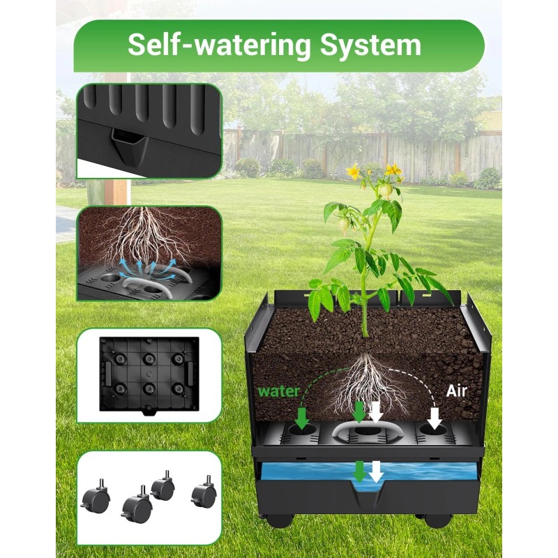 - 【SELF-WATERING】Self-watering design allows plants to absorb water as needed through capillary action to ensure an appropriate amount of water. You only need to inject the right amount of water into raised garden beds outdoor through the water inlet to reduce the frequency and cost of watering.