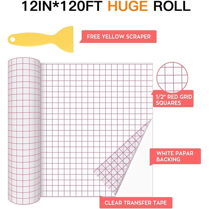 - 【120FT CLEAR RED GRID】 : Our transfer tape for vinyl is 120ft long and adopts with high-quality coated paper, which is smoother than ordinary paper, making the transfer tape easier to tear. The transfer tape roll 1/2”grid is easy for you to measure so that allows you to line up the graphics for easy application.