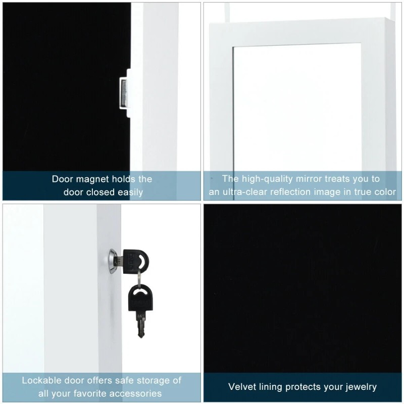 Crafted from high-quality MDF board and topped with a glass mirror, this cabinet boasts durability and stability, ensuring it can withstand the test of time. The innovative design includes multiple storage solutions such as six lined shelves for earrings, five rows of ring slots accommodating up to 60 rings, 29 hooks for necklaces and bracelets, as well as two storage drawers and a designated scarf rod. Its space-saving door-mounted design allows for effortless organization without sacrificing floor space, making it the ideal solution for any size room.