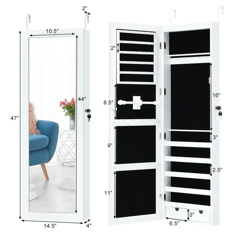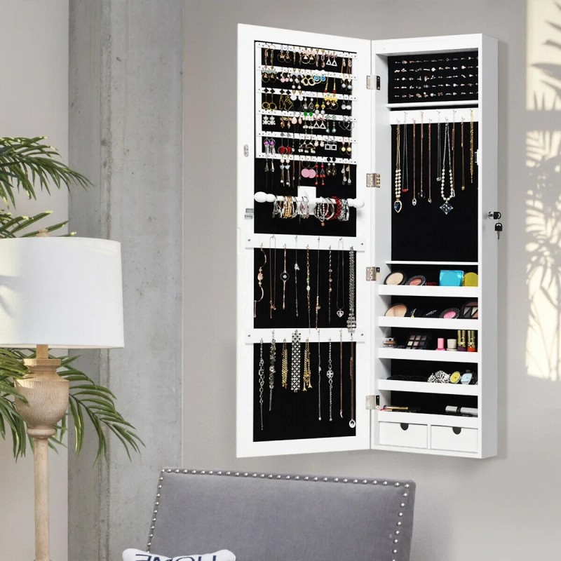 The Wall Mounted Mirrored Jewelry Cabinet Organizer with LED Lights is a sophisticated addition to any bedroom. Designed to keep your jewelry and accessories organized and easily accessible, this elegant cabinet features a full-length mirror that is perfect for trying on outfits and ensuring your ensemble is flawless. The incorporated LED lights illuminate your precious items, adding a touch of luxury and making it easier to find precisely what you need, day or night. With its chic design and practical functionality, this piece seamlessly complements your bedroom décor while providing a stylish solution for your jewelry storage needs.