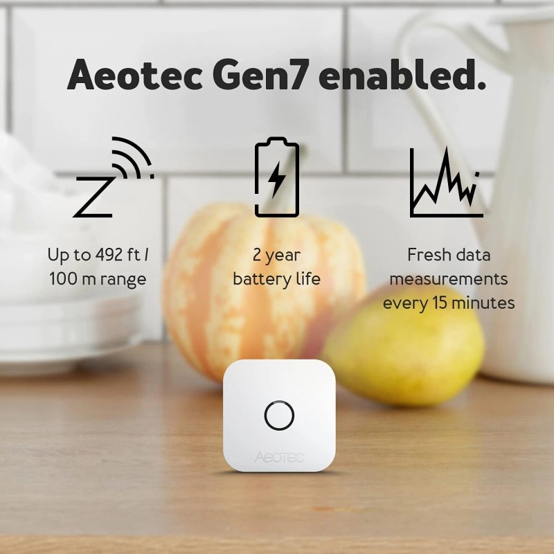 Each of these data points and sensors within aërQ Temperature and Humidity Sensor are transmitted wirelessly from the sensor to the compatible Z-Wave gateway it's connected to. Particular data points require gateway compatibility. The sensor is tested to be compatible with AutoPilot, Fibaro, Home Assistant, HomeSeer, Indigo 7, and Z-Wave JS. To see if your gateway is compatible, check aeotec.com/z-wave-gateways/compatibility.html