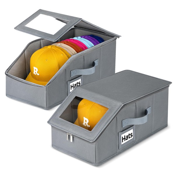 Dofilachy 2 Pack Stackable Hat Storage for Baseball Caps, Holds 28 Caps - Closet Organizer Box with Clear Window & Cardboard,Sturdy Snapback Hat Boxes for Home Storage (grey, 2)