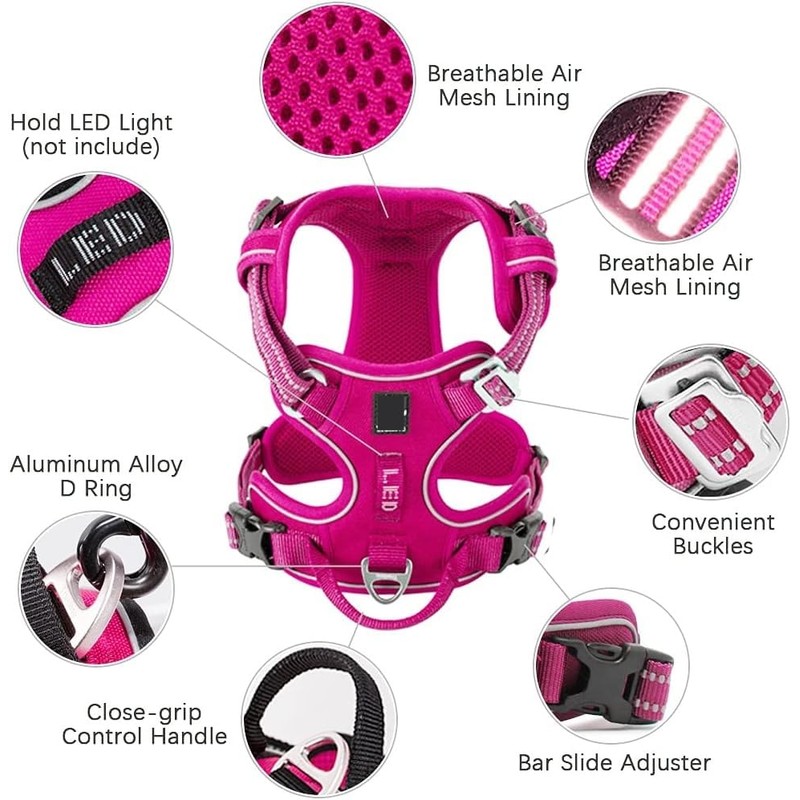 - 3 SNAP BUCKLES & NO NEED OVER THE HEAD: This updated version mesh harness for dogs has 3 Fast-release buckles (ONE is on the neck strap, made from lightweight Aviation Aluminum; TWO are on the chest, made of PC/polycarbonate which has large loading capacity), Easy to Put on & Take Off. This will let your dog love to wear this front clip harness!