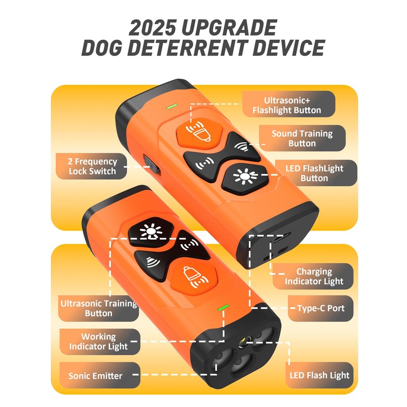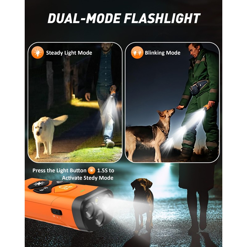 - 6 - IN - 1 ANTI - BARKING DEVICE - Our dog bark deterrent device, much like the one you may be familiar with, integrates training and barking control functions seamlessly. It utilizes 3 functions: Deterrent Flash, Sound, and Ultrasonic, along with 2 ultrasonic frequencies. The built - in LED flashlight effectively captures the dog's attention, preventing excessive barking and rapidly and painlessly correcting or training the dog's behavior.