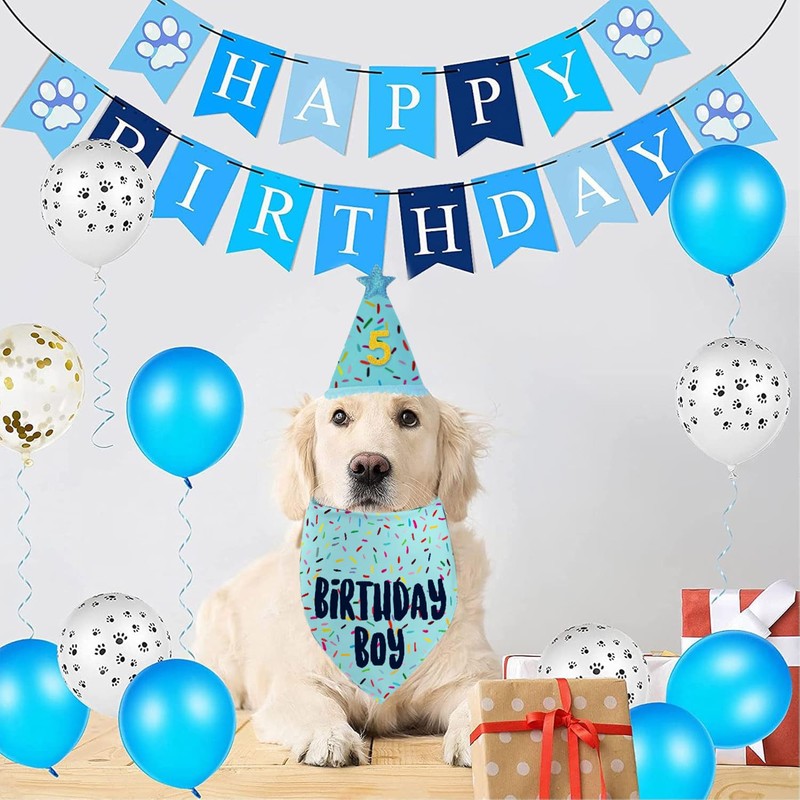 Dog Birthday Bandana Set, Blue Birthday Boy Decorations, HBD Party Supplies with Hat Bandana Numbers for Pets