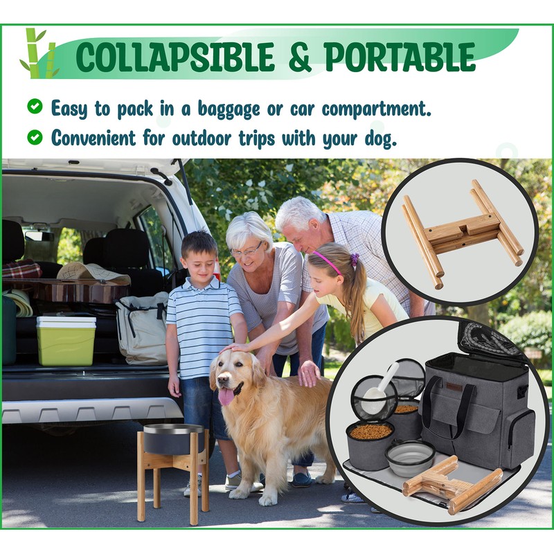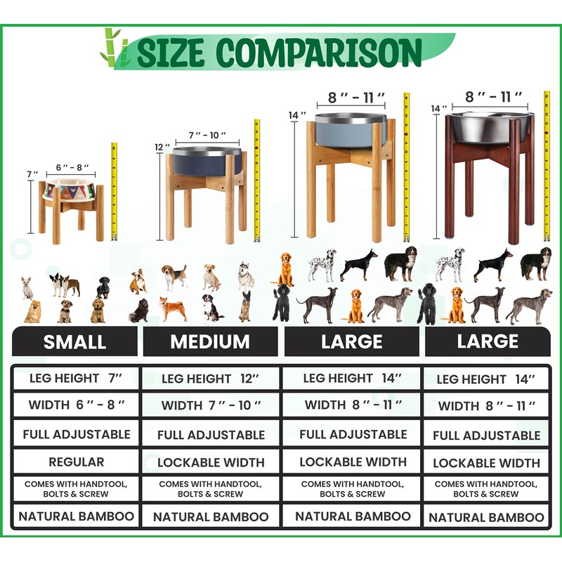 Introducing our multi-purpose, fully adjustable dog bowl stand – perfect for large dogs. Made from kiln dried natural bamboo wood, this stand is both durable and stylish. The expandable width feature allows for any food and water bowl size, from medium to large, to fit comfortably on the stand. Plus, the stand is coated for water and stain resistance, ensuring it will last for years to come. One of the best features of this stand is its adjustable and lockable width. The height is 14 inches and the width can be adjusted from 8 inches to 11 inches, making it suitable for any dog bowl size, shape, or design. Whether you have a ceramic bowl, stainless steel bowl, or even a plastic bowl, this stand will accommodate it. Plus, with the lockable railings, your pet's bowl will stay securely in place. Not only is this stand perfect for regular bowls, but it's also great for slow feeder bowls. The stand can hold any size and shape of slow feeder dog bowls, so your pet can enjoy their meals at a slower pace. And, if you're someone who frequently travels with your pet, this stand is perfect for you. It's collapsible for easy storage and can be conveniently packed in a travel bag or car compartment for outdoor trips. Assembling the stand is a breeze – it only takes around 1 minute to set up by just stacking the lower and upper side. The stand also comes with a screw and tool for assembly, as well as rubber foot pads for floor protection. And, if you already have a bowl that you love, you can use it with this stand and save money – no need to buy a bulky raised or elevated dog bowl set. So upgrade your old pet bowls and give them the perfect stand to dine on!