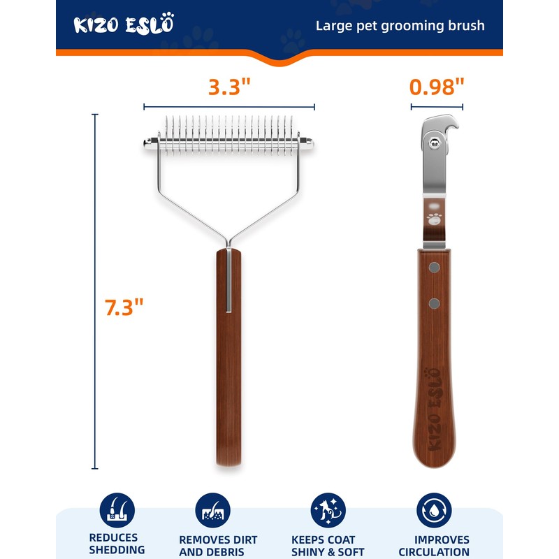 - ☀️【Reduce Shedding Significantly】KIZO ESLO️ double-sided shedding tool quickly demat and detangle pet undercoat rake and effectively reduces shedding by up to 97.9%, keeping your home cleaner and your pet's coat in excellent condition. Perfect for use during shedding season.