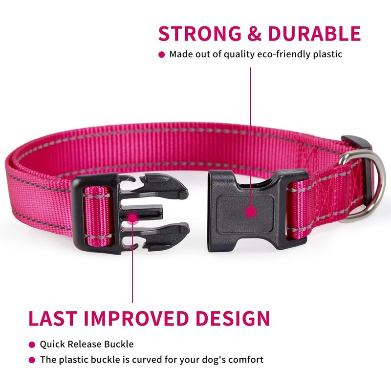 - 🐾 🐕 【Safety Buckle for Comfort and Durability】 The quick-release buckle on this reflective dog collar is made of premium ABS, allowing for easy one-handed release. Lighter than metal buckles, it enhances your dog's comfort, while the curved plastic buckle adds an extra layer of comfort. The chrome-coated metal D-ring of the dog collar improves its durability, making it perfect for everyday use.