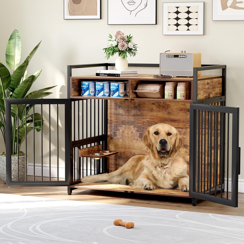 - [ADJUSTABLE DOG FOOD BOWL] Experience the convenience of a furniture-style dog cage equipped with 2 stainless steel dog food bowls that can be rotated 360 degrees and adjusted to 3 heights. Promote healthy digestion and support your dog's cervical spine with this adjustable feature, enhancing your pet's overall well-being.