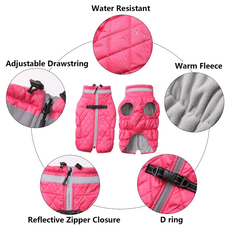Dog fleece coat with D ring warm coats jackets dogs puppy snowsuit zipper closure for yorkie terrier schnauzer poodle border collie labrador small medium breeds - Pink - Large
