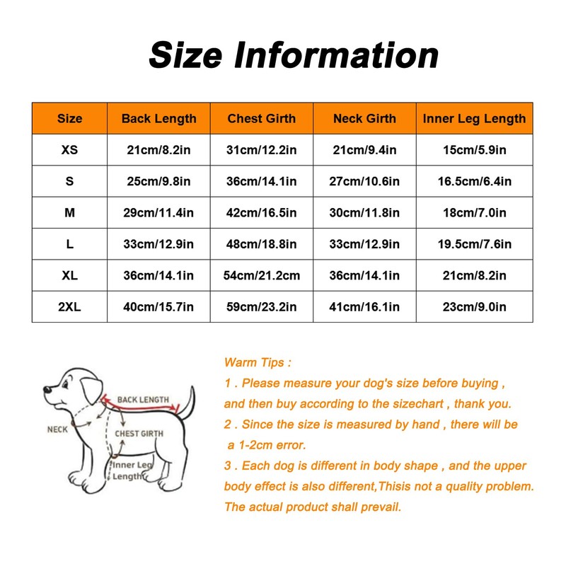 - Dog Warm Clothes Size: M - Back Length 29cm/11.4in,Chest Girth 42cm/16.5in,Neck Girth 30cm/11.8in,Inner Leg Length 18cm/7.0in.Please measure your dog's size before buying, and then buy according to the size chart, thank you.