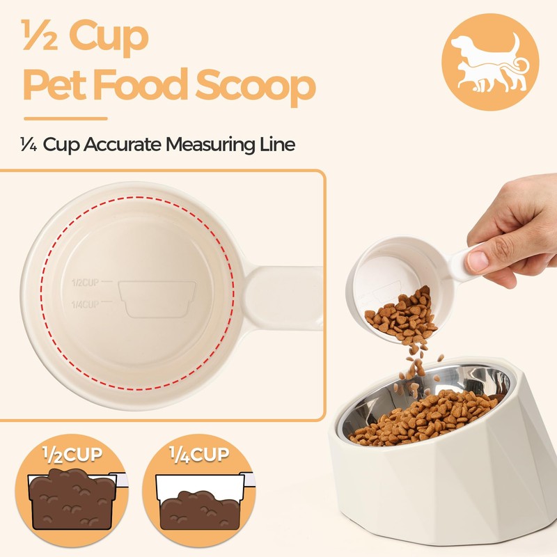 - 1/2 Cup Capacity - The pet food scoop measures 0.5-cup measuring cup with 1/4 cup measurement marked. It is used to measure pet food proportion exactly to make a standard diet.