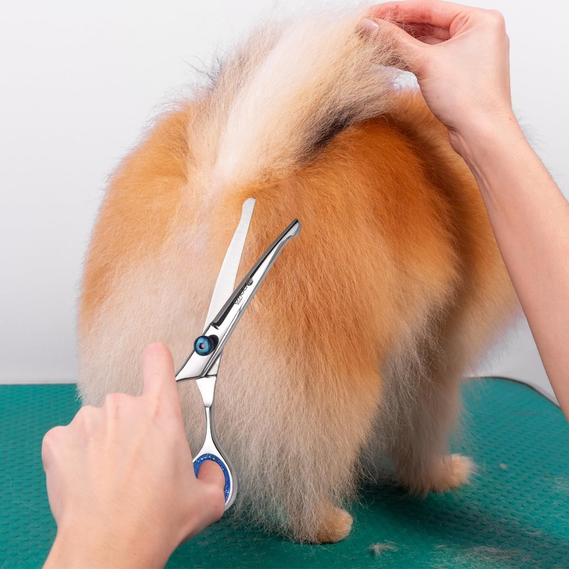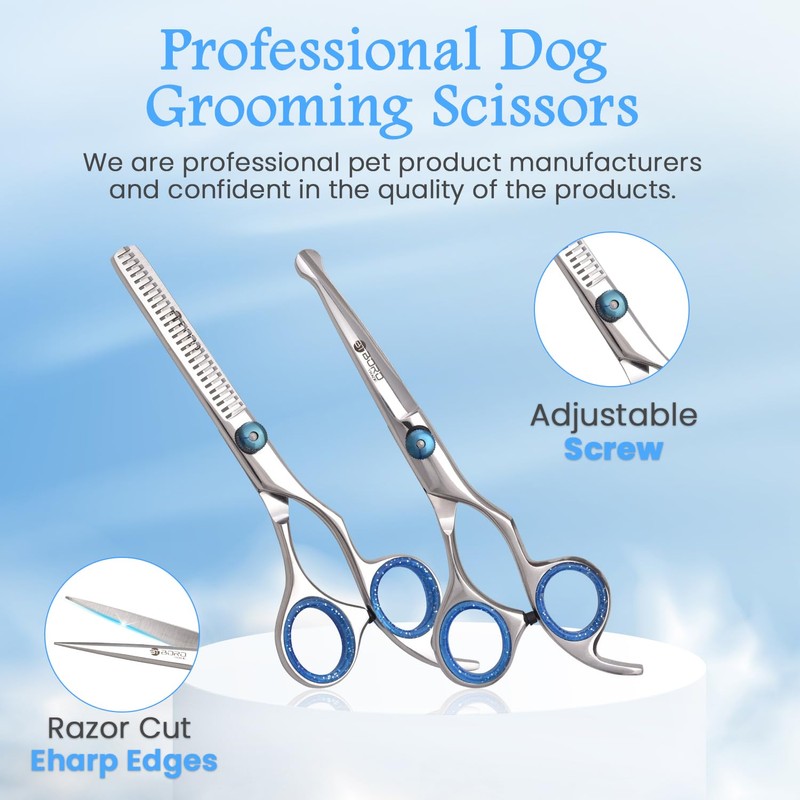 - Dog Grooming Scissors Set with Safety Round Tip, Curved Pet Cat Hair Cutting Trimming Grooming Shears, Also Include Thinning Scissors & PU Leather Pouch (Stainless Steel)(6 Inches)(Chrome) (2 Pieces)