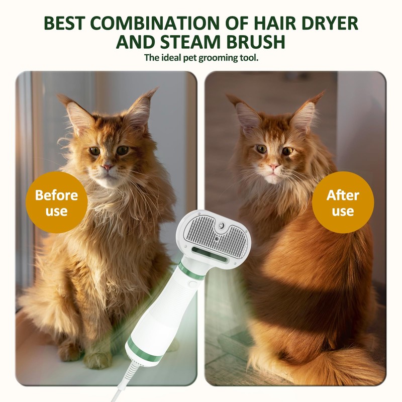 - 【5 IN 1 CAT STEAM BRUSH】This 5 in 1 Function Cat Blow Dry Spray Brush combines 5 functions of blow drying, spraying, grooming, massaging, and cleaning in one unit, designed for the daily care and cleaning of your pet cat. Whether it's blow drying after a bath or daily grooming and cleaning, it's easy to do. This Cat Drying Steam Brush is especially suitable for long-haired cat breeds that require frequent grooming to help save time and energy