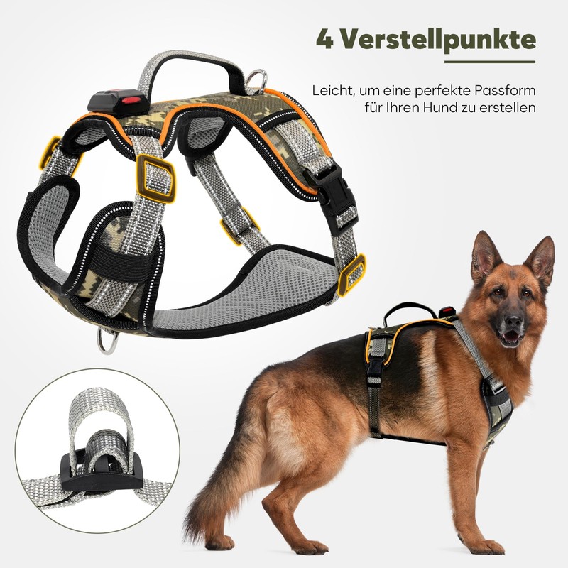 - A light harness for dogs, developed by our engineers especially for the German market, quickly gained great popularity after a successful start in the USA. Now we have optimised it and bring this unique tableware to the German market to meet the needs of German consumers. It uses unique light guide technology and fashionable camouflage fabrics, which makes it unique on the German market.