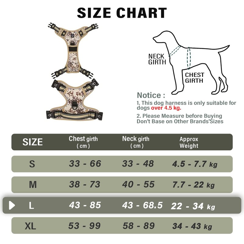- Size Confirmation - Large Neck Girth: 43-68.5cm, Chest 43-85cm Note: Measure your dog's neck and chest at any point that has the widest chest circumference. 2-3 cm may need to be added. It is better to choose a larger size as your dog grows.