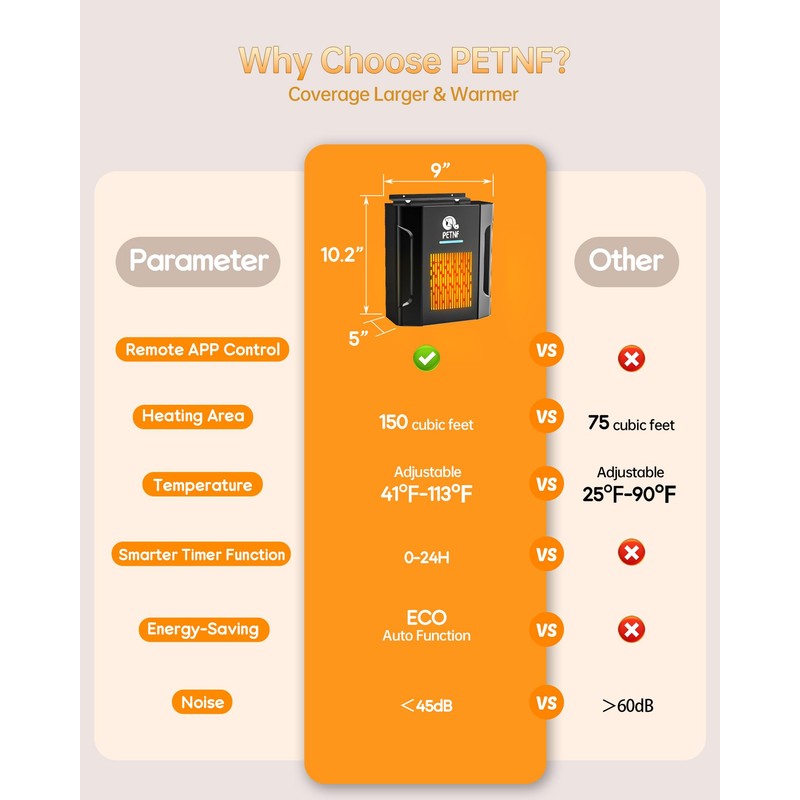 - Convenient Setup & Maintenance: Designed with user-friendly installation in mind, the heater includes clear instructions and requires minimal tools to mount securely in place. Cleaning and upkeep are simple, ensuring long-lasting performance. Compared with larger patio heaters or greenhouse systems, this compact model offers hassle-free operation without complicated steps. Families can set it up once and then enjoy automated performance without constant manual adjustments, keeping focus on pet wellbeing
