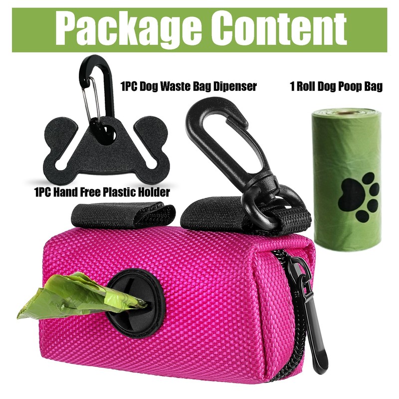 - Hand Free Walking Set - A new great leash attachment set for your dog walking. Enjoying hand free walking without carrying the unused dog poop bags on hand and holding wasted poop bag. This practical set includes ONE Dog Poop Bag Dispensers (Storage Dog poop bags / Bag holder), ONE Dog Poop Bag Holders(Black) & ONE Rolls Waste Bags