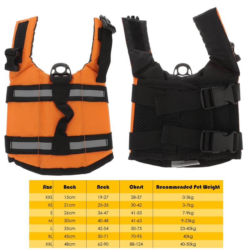 - XXS: 15cm(Back); 19-27(Neck); 28-37(Chest); 0-3kg(Recommended Pet Weight); life jacket for dogs