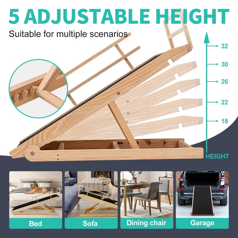 Dog Ramp, 5 Level Adjustable Height Folding Pet Ramp for High Bed, Portable Paw Ramps Large Bed Ramp for Medium & Large Old Dogs & Cats - Natural Wood Furniture Quality
