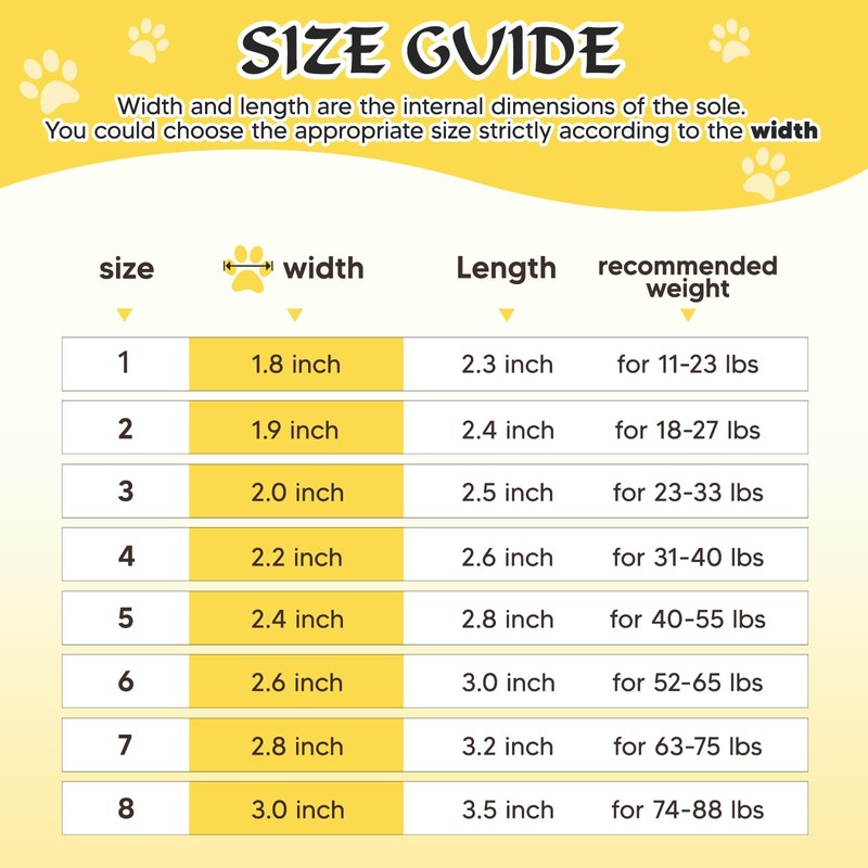 - [SIZE GUIDE] - Clould you be sure to measure width of your dog's paws carefully and check our size chart before purchasing to ensure you are getting the right size. Width is key to choosing the correct size for your dog.