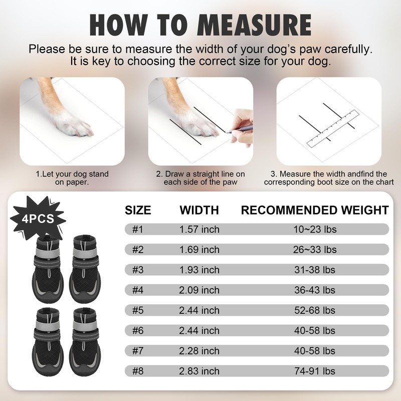 - Dual Adjustable & Secure:These doggie boots come with two nylon straps and dual adjustable fasteners, allowing you to customize the fit according to your dog's needs for a secure fit. Additionally, the reflective straps enhance visibility at night, ensuring your dog's safety.Compared to the old version, the new design features resized straps that ensure a more secure fit on your dog's paws.