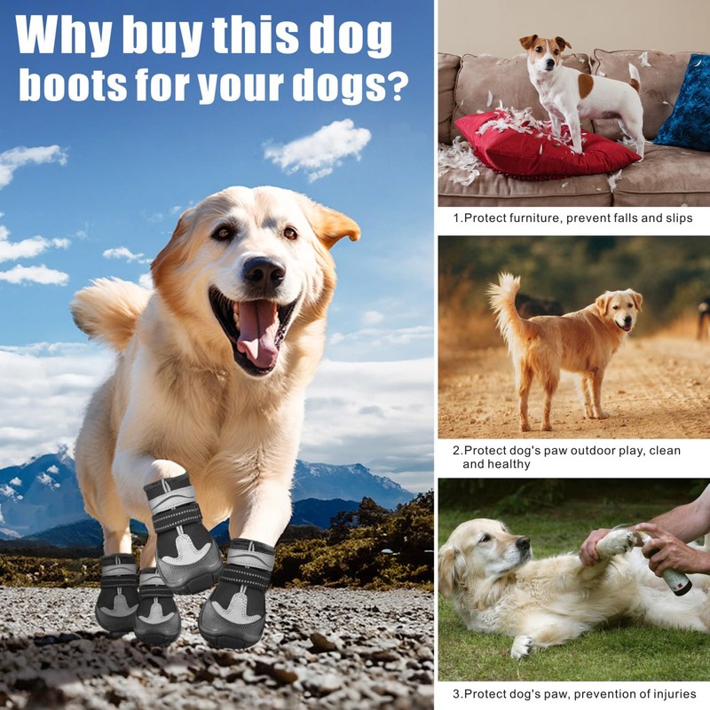 - 【Reflective & Secure】: The reflective design on the dog hiking boots that can improve your dog visibility in the dark and provide protection for them. This dog boots & paw protectors help prevent damage of dog nails to your home hardwood floor and prevent hurt of hot pavement and sharp stuff. It can also protect injured paws from snow and ice in winter.