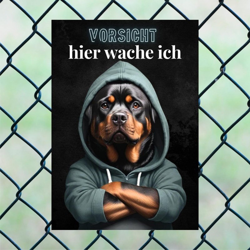 - Great caution home door sign dog sign with dog motif: Vorsicht hier wache ich Rottweiler motif. The dog is wearing a hoodie. The dog sign for your door or garden fence. Weatherproof and UV-resistant printed with great dog motif in the latest UV printing process. Siviwonder
