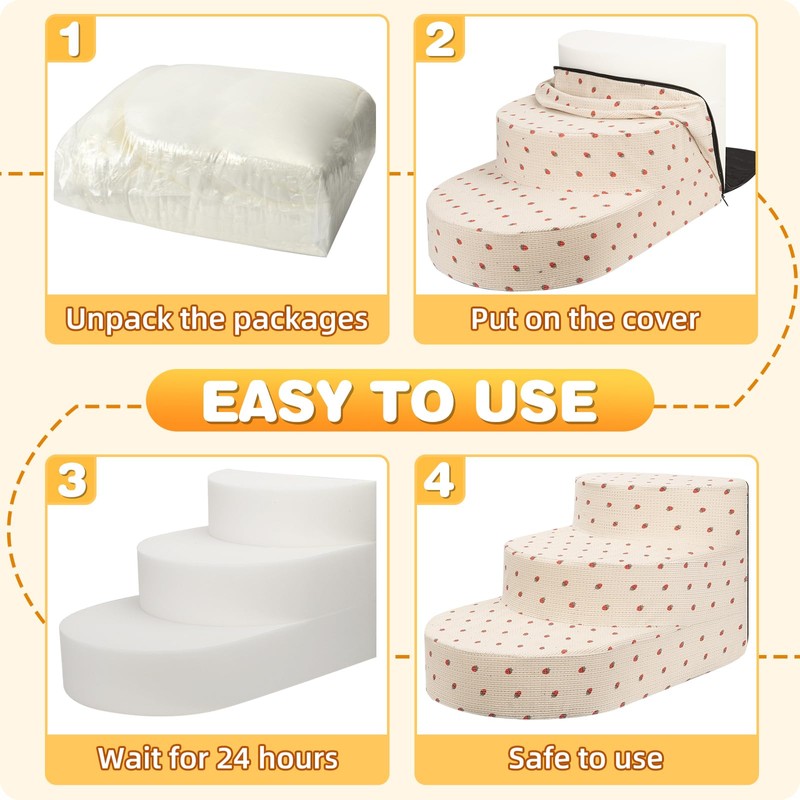 - Special Reminder: The pet steps for small dogs is vacuum compressed and packaged. Once the stairs are taken out of the compression bag, they will quickly return to the original shape of the stairs. It usually takes 24 to 48 hours for the foam to fully expand to fully recover to the maximum size.The dog staircase cover fits snugly, so patience is required when putting it on