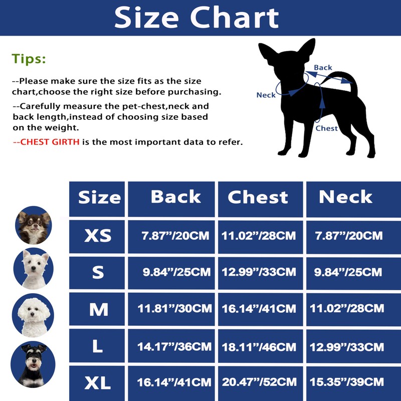 X-Small:chest girth(11.02"/28cm), neck girth(7.87"/20cm),back length(7.87"/20cm),suggested weight(1.5-4.5lb)
