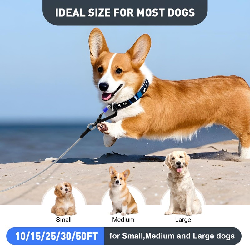 - Versatile and Long-lasting for All Sizes: This cable is designed to fit all sizes, from small dogs to large breeds, with lengths ranging from 10 feet to 50 feet. Whether you’re using it in a backyard, park, or during outdoor adventures, it’s a reliable companion. The reflective coating adds an extra layer of safety, especially in low-light conditions, ensuring your pets are visible and secure at all times